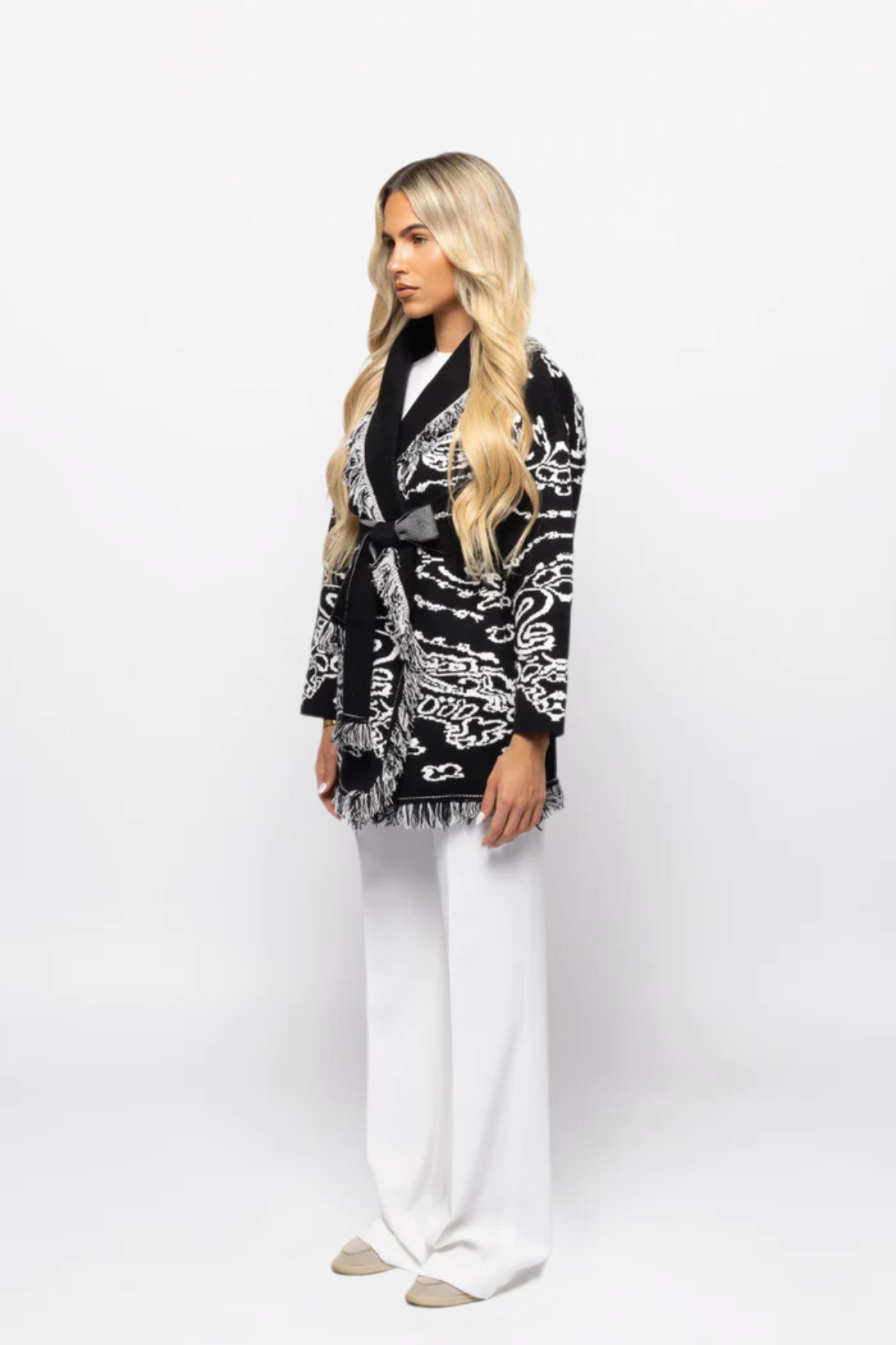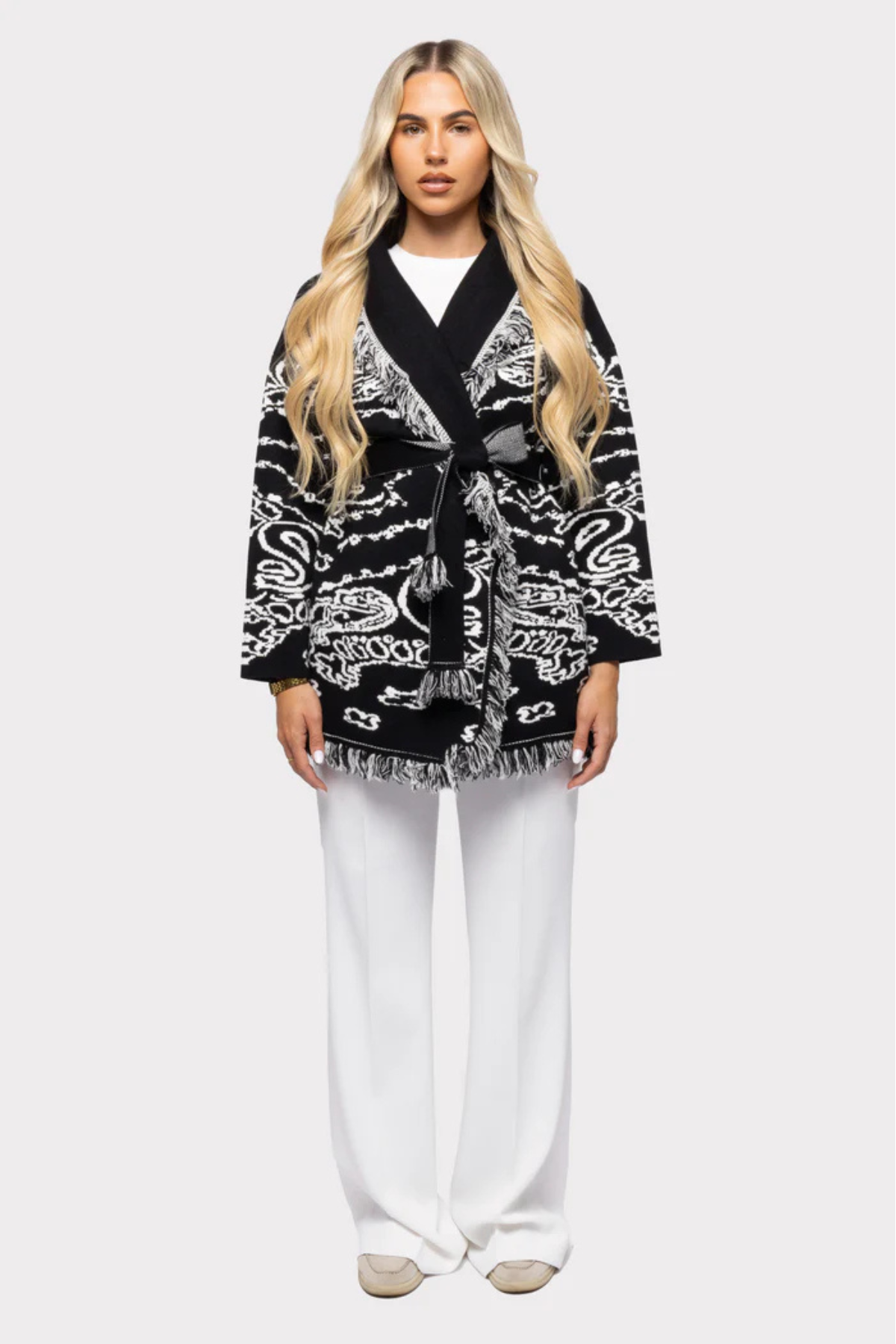 Elevate your wardrobe with our statement printed jackets, designed to combine effortless style with everyday versatility. Crafted with premium fabrics and finished with a belted waist for a flattering silhouette, each piece is detailed with bold patterns inspired by iconic destinations. Perfect for layering from day to night, these jackets bring a touch of luxury and individuality to any look. This Piece is crafted from 50% Viscose, 28%Polyester,22%Pbt