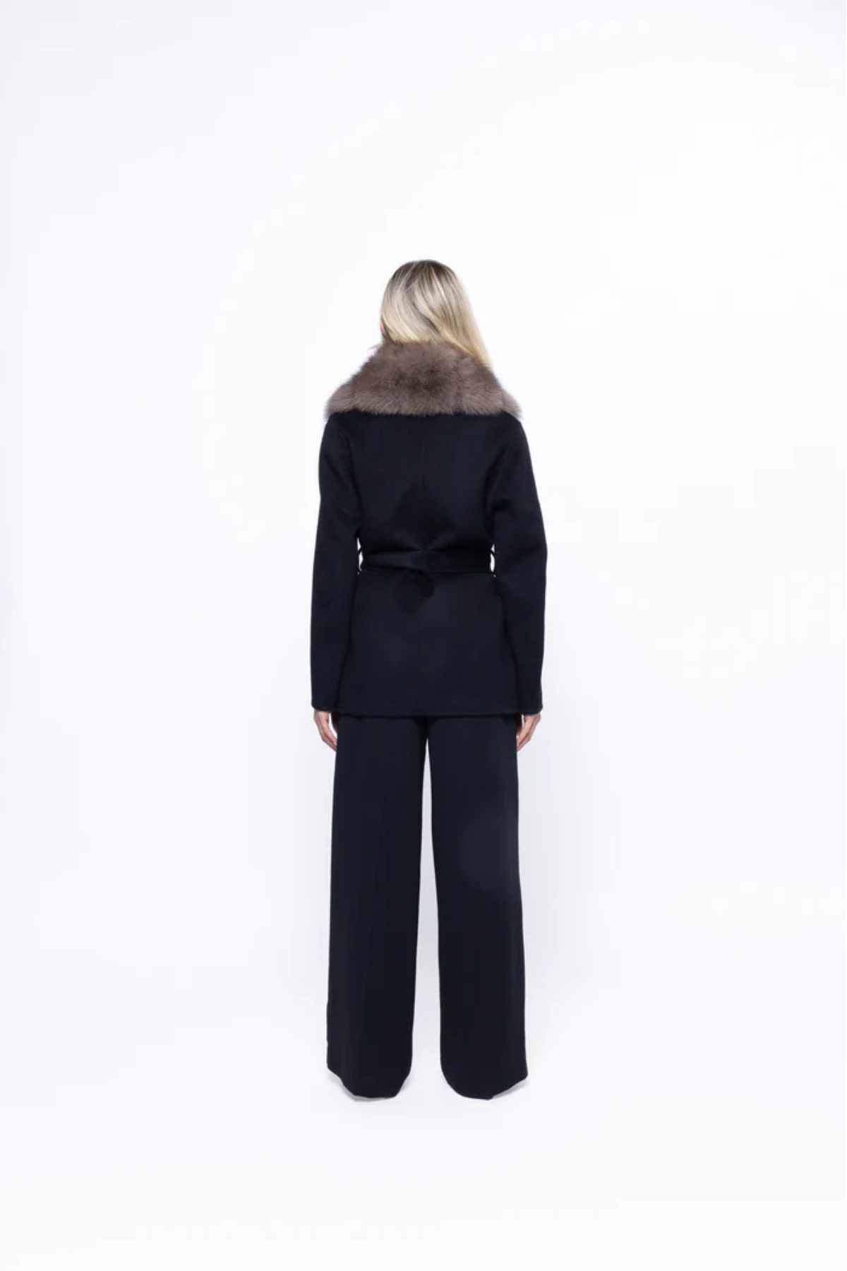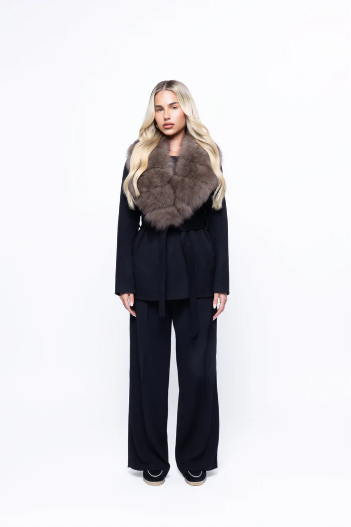 Black Wool Wrap Coat with Fur Collar Crafted from 100% wool, this refined wrap coat features a dramatic oversized fur collar that adds warmth and sophistication. The collar is fully detachable, giving you the versatility to wear it with or without the fur depending on the occasion. Finished with a belted waist for a flattering silhouette, it’s a timeless statement piece designed for both day and evening elegance.